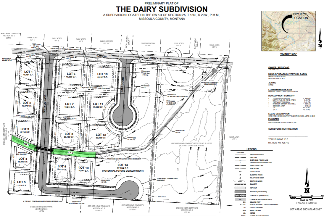 Developer Tai Tam LLC is requesting to amendments to The Dairy subdivision in the Target Range neighborhood west of Missoula. The county commissioners originally approved The Dairy as a 14-lot major subdivision in 2022, subject to 25 conditions of approval, and set to expire on July 7, 2025. The developer, represented by Professional Consultants Inc., is requesting to: