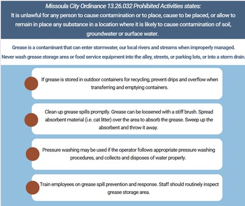 To report an illicit discharge, or for questions about stormwater sampling, please contact Kelsie Alling at kalling@missoulacounty.us or 406-258-4968.